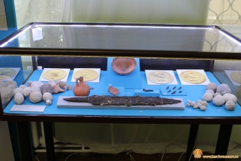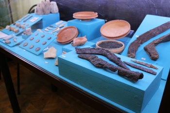 На выставке представлены находки последних лет: керамика и гончарный круг, боспорские и римские монеты, римский меч — «гладиус», лапидарные памятники, а также клад жертвоприношения, спрятанный жителями крепости в момент вражеского штурма.