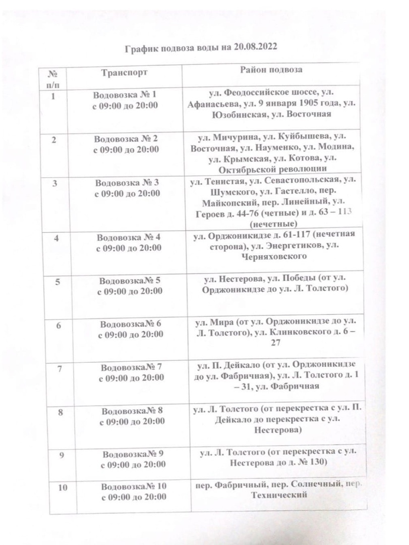 Керченский филиал ГУП РК «Вода Крыма» информирует, что в связи с аварийной ситуацией на магистральном водоводе Ду-700 мм 20.08.2022 будет ограничено водоснабжение и снижено давление воды по следующим адресам: пос. Партизанский (ул. Феодоссийское шоссе, ул. Мичурина, ул. Восточная и прилегающие к ним улицы и переулки), ул. Орджоникидзе (нечетная сторона), ул. Л. Толстого, ул. Нестерова, ул. Победы, ул. Мира, ул. П. Дейкало, ул. Клинковского, ул. Тенистая, ул. Героев, а также на прилегающих к ним улицах и переулках, - передает Керчь.ФМ.