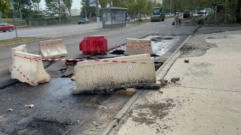 В Керчи на дублере улицы Генерала Петрова оградили часть дороги. Напомним, вчера, около здания женской консультации, провалился под дорогу самосвал с асфальтом, - передает Керчь.ФМ.