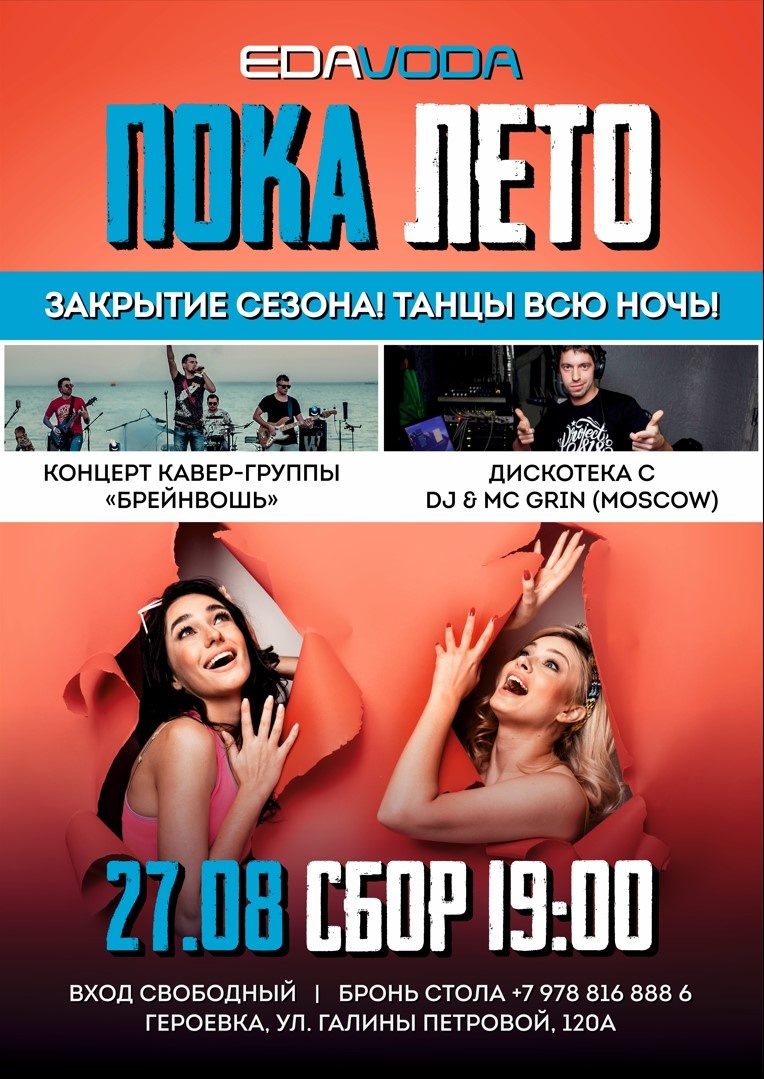 Для вас выступит под парусами кавер-группа «БрейнВошь», в исполнении которой прозвучат любимые композиции всех времен! После концерта артисты передадут эстафету DJ & MC GRIN (г. Москва), который зажжет танцпол на нижней палубе кафе.