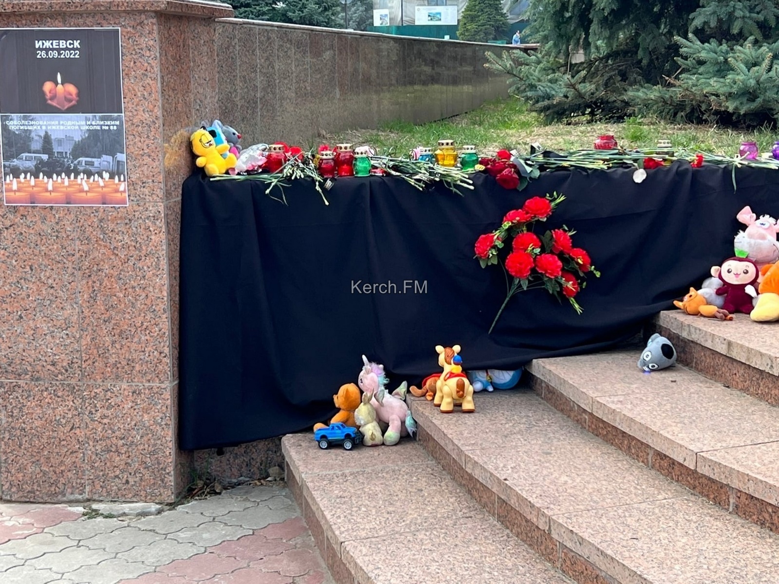Керчане 26 сентября почтили память погибших в Ижевске. Горожане принесли к импровизированному мемориалу у площади Ленина цветы и мягкие игрушки, - передает Керчь.ФМ.