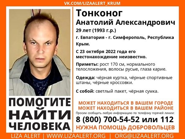 В Крыму 23 октября без вести пропал Тонконог Анатолий Александрович, 1993 года рождения, - передает Керчь.ФМ.