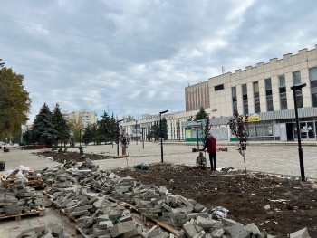Сегодня, 27 октября рабочие высаживали в клумбы кустарники и деревья. Также часть территории у доски почета оставили под парковку автомобилей. Здесь установили бордюры и засыпали щебень. Территорию готовят под асфальтировку.