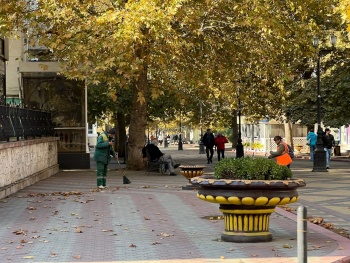 Днем 27 октября на улице Ленина работает большая бригада дворников. Они сметают листья в кучи, а после вывозят. Но листья, все продолжают падать.