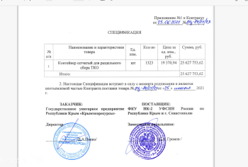 25 июня 2021 года Крымэкоресурсы закупили у ФСИН 1323 контейнеров 1, 1 куб.м по цене 19 370, 94 рублей за штуку. На общую сумму 25 627 753, 62 руб. Если б покупали по прайс-листу то вышло бы 25 137 000, разница 490 753, 62 рубля.