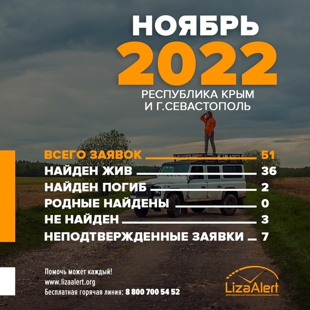 В ноябре в поисково-спасательный отряд «ЛизаАлерт» поступило 51 заявка на поиск людей. Из них 7 не подтвердились. Об этом пишет КИА, - передает Керчь.ФМ.