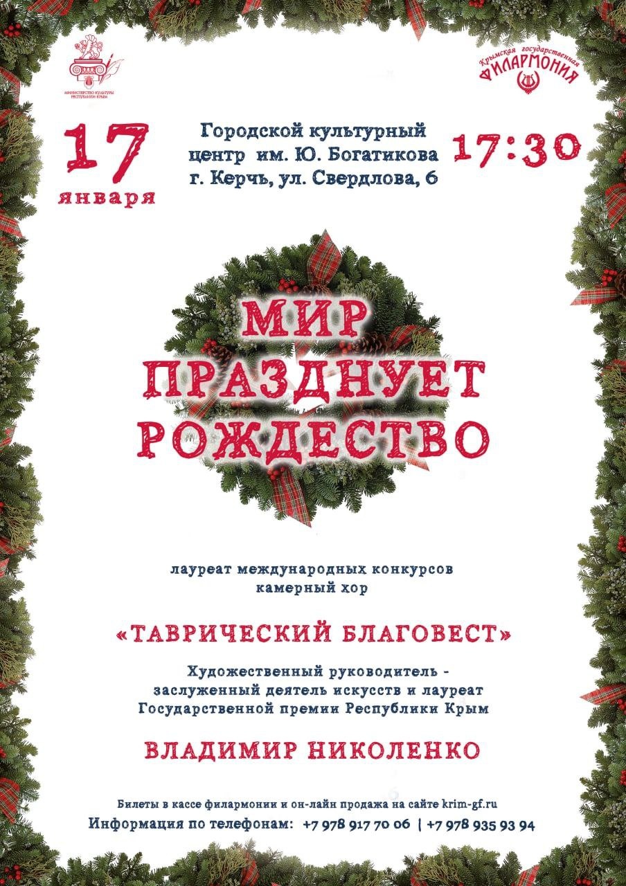 Крымская государственная филармония приглашает гостей на программу «Мир празднует Рождество». Для зрителей прозвучат сочинения Нижанковского, Рахманинова, Леонтовича, Калистратова, Файнера, Шебалина, Стеценко, написанные для хора а-капелла, - передает Керчь.ФМ.