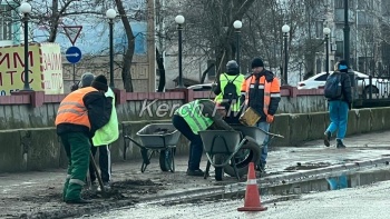 В Керчи на улице Еременко коммунальщики борются с грязью на тротуаре. Они собирают ее в кучи, а после вывозят, - передает Керчь.ФМ.