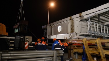 В агентстве рассказали, что третий пролет сегодня при помощи домкратов по накаточным балкам передвинули на опорные тумбы и приступили к опусканию металлоконструкций.