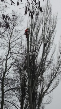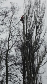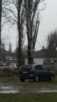 Работы проводят на высоте, но рабочий находится на самой макушке дерева, прямо на нем. Керчане восхищаются смелостью рабочих, но и немного переживают за них.