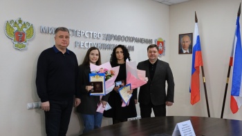 Сегодня министр здравоохранения Республики Крым Константин Скорупский и главный врач ГБУЗ РК «Центр крови» Игорь Чемоданов передали ведомственный знак отличия Федерального медико-биологического агентства - медали «За содействие донорскому движению» донорам клеток костного мозга Бахаревой Наталье и Сургучевой Елене.