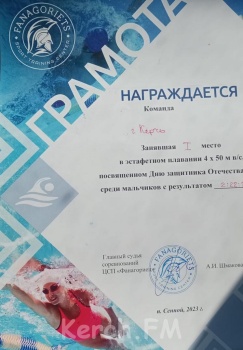 Юные керчане также успешно выступили на соревнованиях, были лучшими на многих дистанциях, завоевали призовые места, выполнили разрядные нормативы, а в эстафетном плавании 4х50 м. вольным стилем заняли первое место.