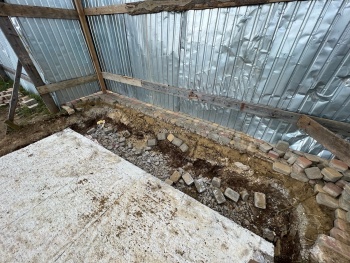 Так, здесь залиты основные ступени, нет еще перехода к мостику, не сняты ограждения противооползневых работ. Также на ярусах ниже стоят резервуары для сбора воды, которые пока еще не смонтировали до конца.