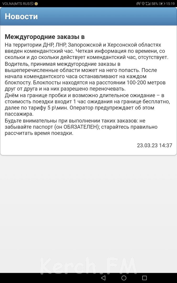 Проблемы с уровнем опасности испытывают не только керченские водители автобусов и пассажиры, но и водители такси. На днях в рассылке им прислали довольно интересные сообщения. Одно из них было про планирование поездок на север и восток от Крыма.