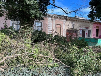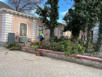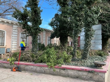 В Керчи на улице Театральной приступили к обрезке деревьев. Так, рабочие пилят  ветки деревьев и сразу погружают их в контейнеры, которые привезли и поставили рядом, - передает  Керчь.ФМ.