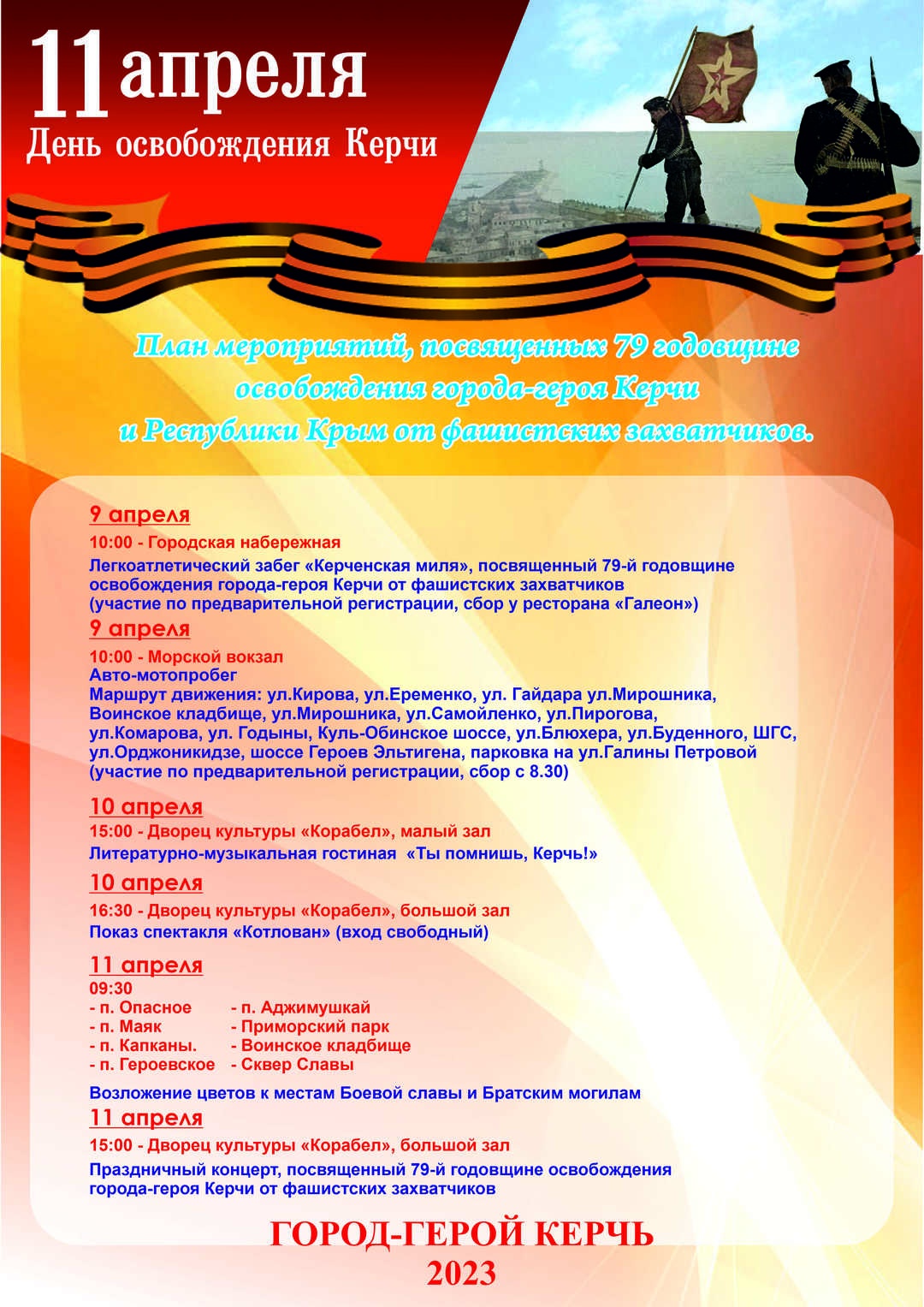 В Керчи с 9 по 11 апреля пройдут мероприятия, посвященные празднованию Дня освобождения Керчи.  Администрация опубликовала подробный план, - передает  Керчь.ФМ.