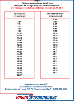 В период поминальных дней, с 22 по 25 апреля, движение автобусов на маршрутах № 21 "Аршинцево - Партизанский" и №8 "Автовокзал - завод "Коралл" будет осуществляться по изменённому графику. Об этом сообщает пресс-служба администрации Керчи, - передает Керчь.ФМ.