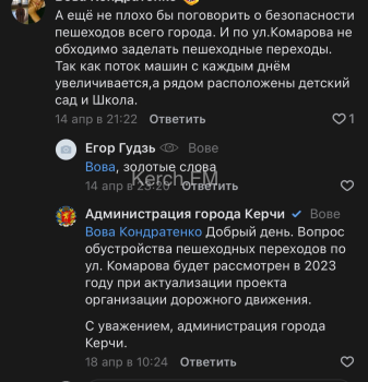 Керчане просят администрацию города сделать пешеходные переходы на улицах Комарова и Жени Дудник. Особенно рядом со школой №4. Горожане обращают внимание на то, что на данных улицах увеличился поток машин, - передает Керчь.ФМ.