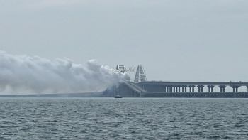 Обновлено. К 10.30 белый дым рассеялся и видно, что мост целый. На месте, где был чёрный дым - в районе автоподходов, вновь запустили дымовую шашку - все покрылось белым дымом.