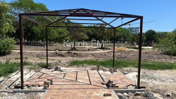 Кроме этого, уже появляется каркас нескольких металлических беседок. Рабочие их окрашивают. Также, заасфальтировали часть газона.