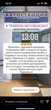 купить билеты на рейсовый автобус в Темрюке и тогда мы сможем попасть на паром. Приехали в Темрюк - диспетчер говорит, что все рейсы на Крым отменены до особого распоряжения. Кто-то скажет, что конкретно нужно делать? Кроме как ехать через Мариуполь?