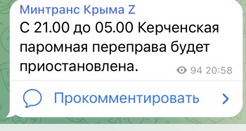 Минтранс Крыма сообщил в 20:58 о приостановке работы паромной переправы. Паромы не будут выходить из порта  с 21:00 до 5 утра завтрашнего дня, - передает Керчь.ФМ.