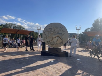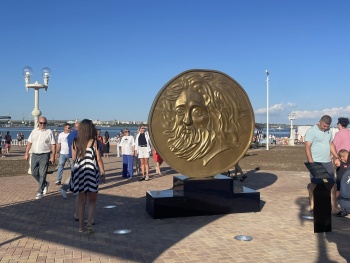 Примечательно, что в центре аллеи стоит архитектурная форма в виде монеты на подставке. Это изображение монеты с сатиром и грифоном с клинком в клюве, которую нашли в Керчи. До 30-х годов монету хранили в Эрмитаже, а затем из-за нехватки денег Советской России продали коллекционеру во Францию. В 2012 году монету перекупили за 3, 3 млн долларов, а в этом году цена выросла до 6 млн долларов, что стало рекордом на аукционах по нумизматике.