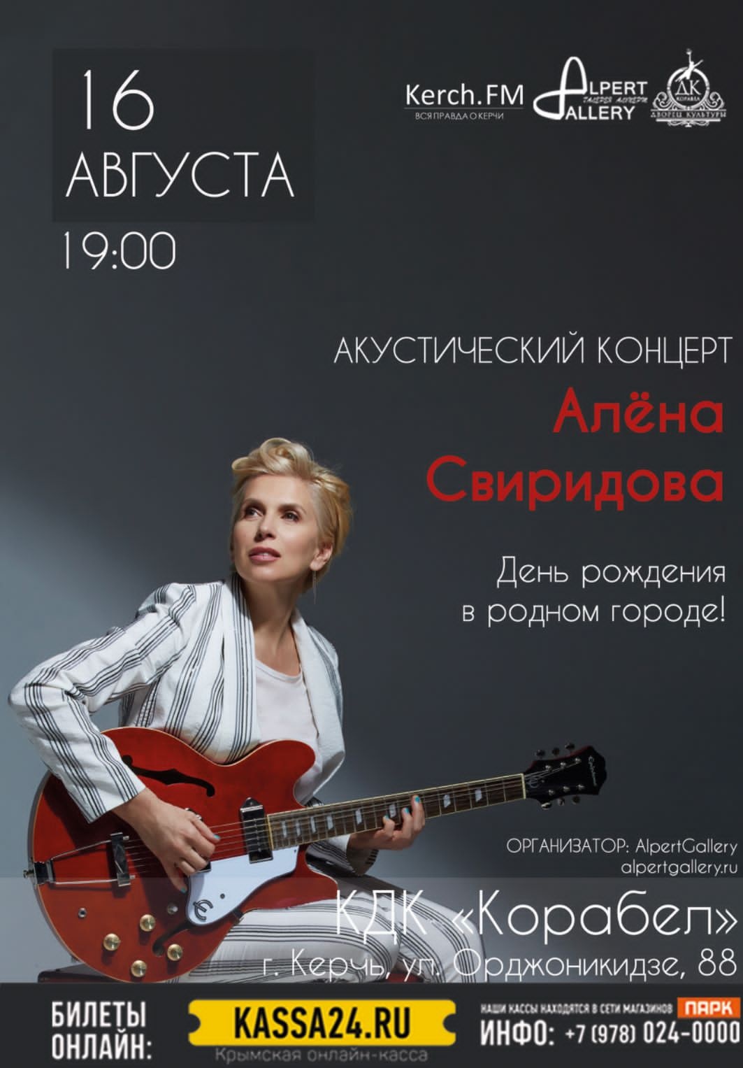 Те, кто по достоинству способен оценить живую музыку, когда нет фонограммы, когда не подкручивают фальшивые ноты, когда не дотягивают до нужного диапазона, те имеют возможность прийти на акустический концерт Алены Свиридовой 16 августа в ДК Корабел.