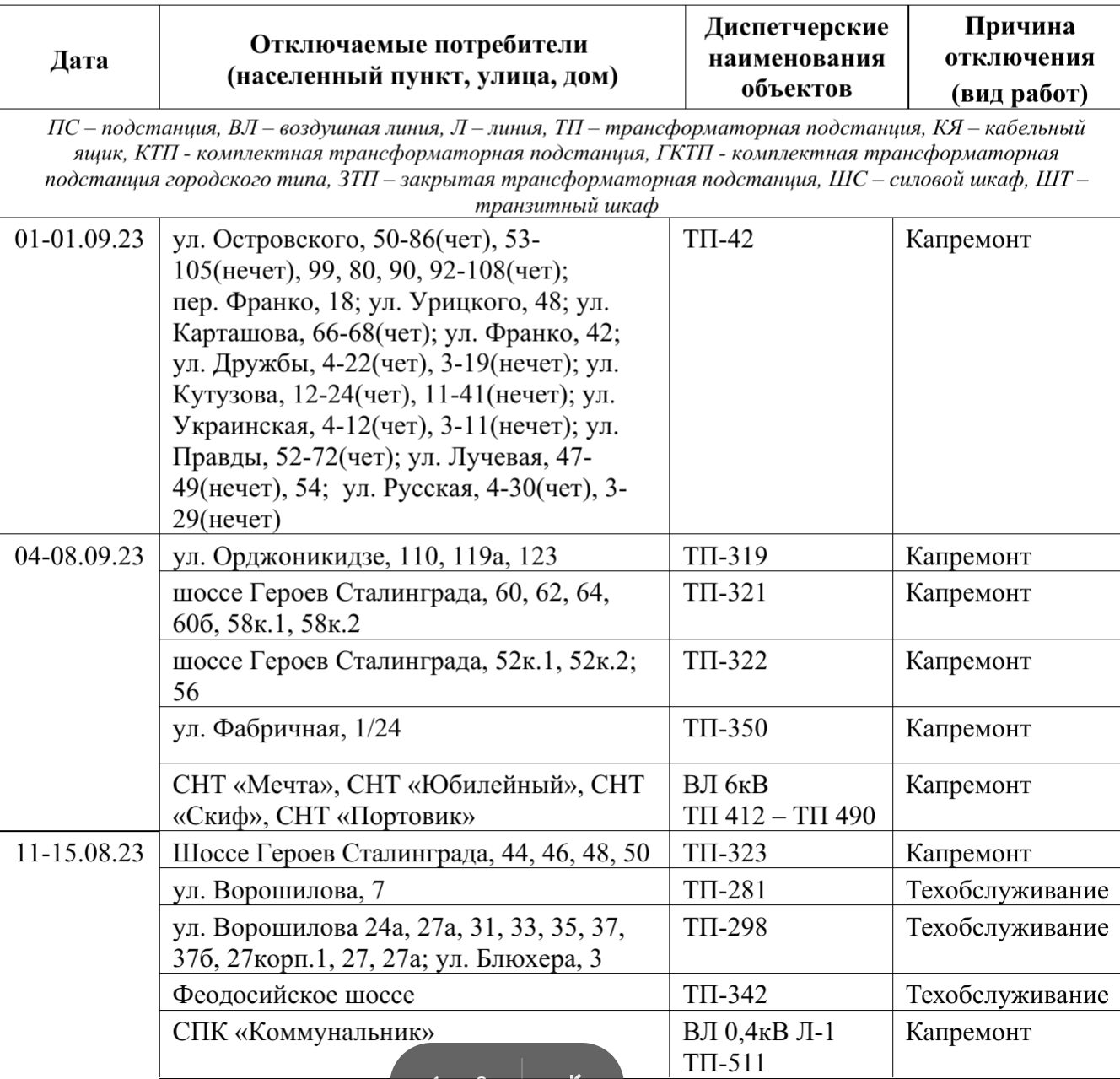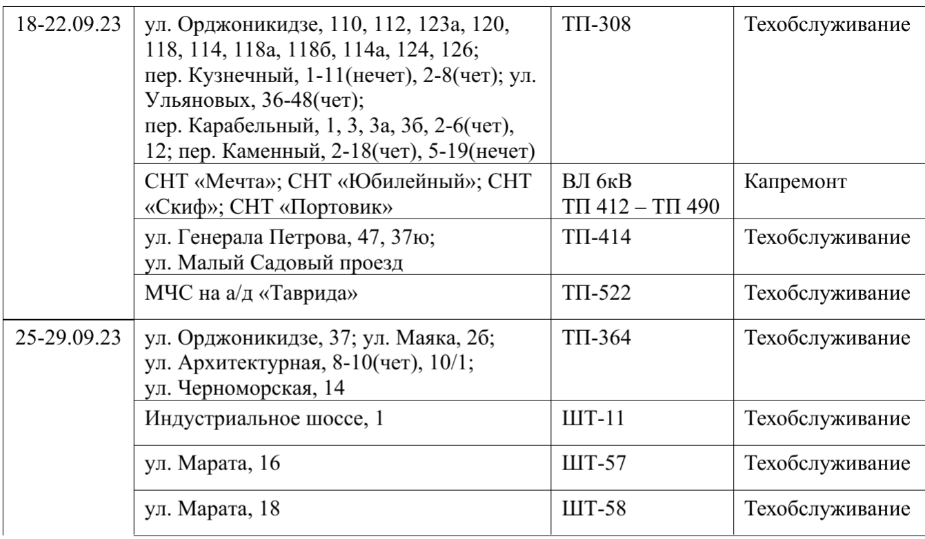 В связи с плановым ремонтом электрооборудования в сентябре в период с 8 до 17 часов будут происходить отключения линий электропередачи согласно нижеприведенному графику. Об этом сообщает ГУП РК «Крымэнерго», - передает Керчь.ФМ.