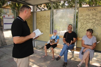 На остановке "Дружба" в районе Аршинцево он пообщался с пассажирами, ожидающими автобусы.