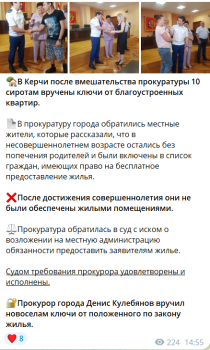 В Керчи в пятницу 10 сирот получили квартиры. Прокуратура пишет про это событие и сообщает, что они красавцы принудили администрацию, администрация Керчи хвалит себя. Сироты тем временем сами стали родителями, и им так абсолютно все равно кто и кого за это хвалит, - передает Керчь.ФМ.