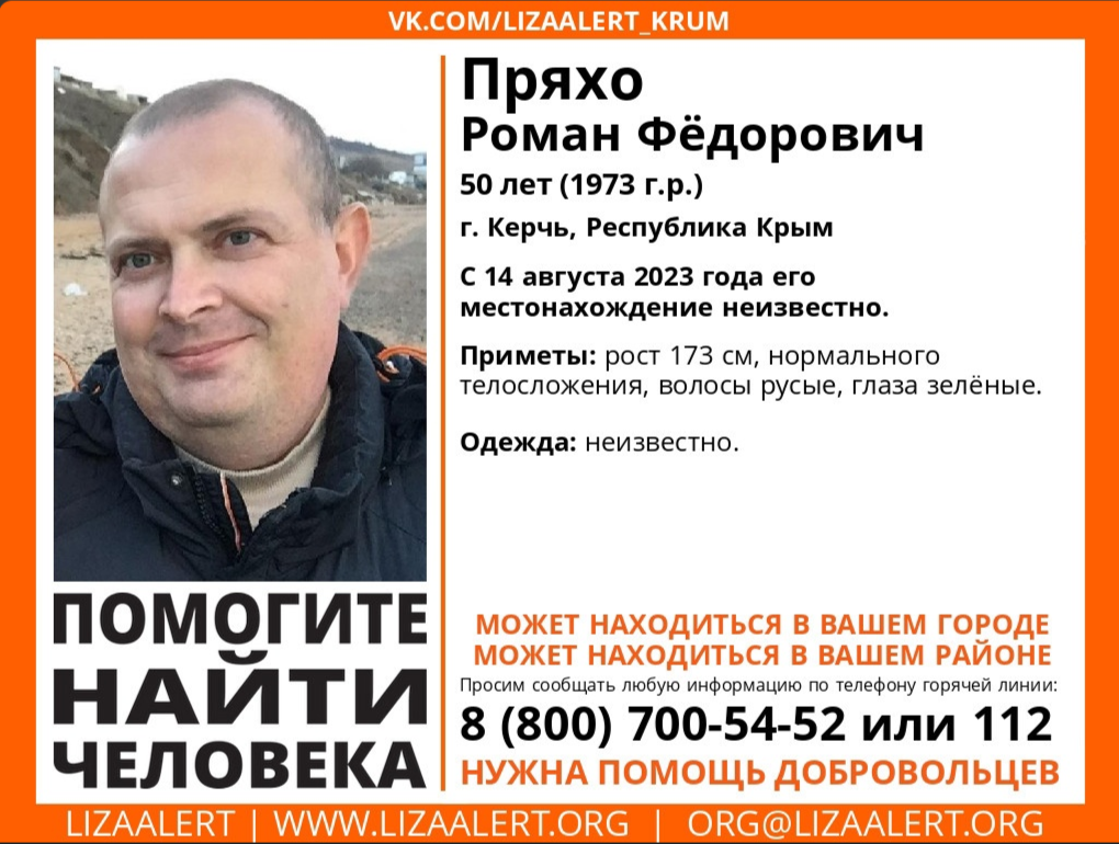 "Пропал #Пряхо Роман Фёдорович, 50 лет (1973 г.р)