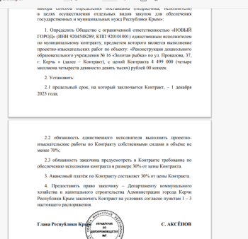 "Новый город" был назначен единственным исполнителем главой Крыма Аксеновым. Пока компания выполняет свои обязательства в срок: выполнила инженерные изыскания, согласовала с администрацией, разработала проектную документацию, и, как указано в контракте, передала ее на согласование заказчику. Теперь дело за администрацией. Если хватит компетенции, согласует, подрядчик подаст на госэкспертизу. А если не хватит компетенции, знаний, квалификации, смелости в конце концов, то и дальше дети будут ждать своего детского сада, но видимо не для себя.
