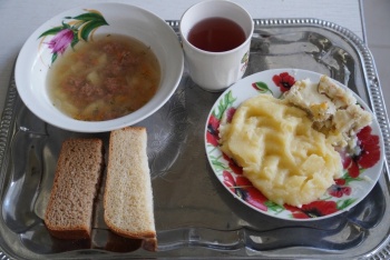 Вот только, что в одной тарелке лежит у детей не понятно. Пюре, а что с ним лежит рядом под большим вопросом. То ли это тушенка в слое жира сверху, то ли неизвестная субстанция. Предполагать можно вечно.
