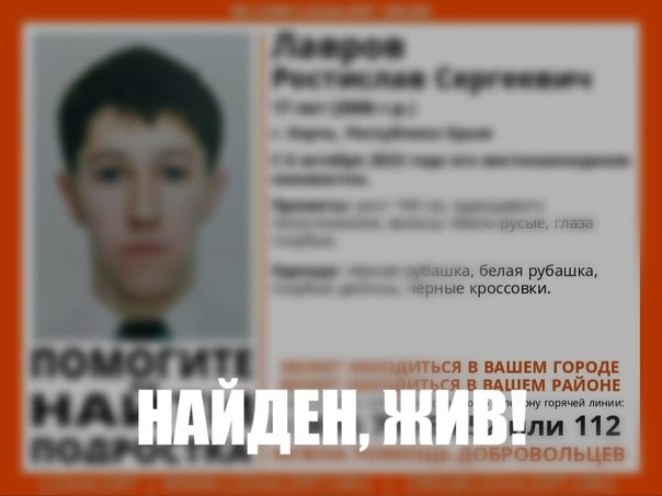 В результате поисков волонтёры крымского отделения поискового отряда «Лиза Алерт» отыскали пропавшего в Керчи 17-летнего Ростислава Лаврова. Об этом говорится в сообщении поискового отряда в соцсетях, - передает Керчь.ФМ.
