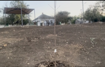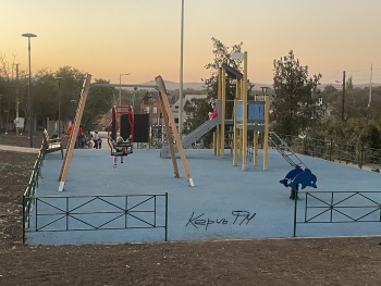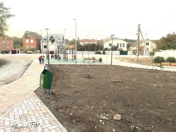 Редакция Керчь.ФМ вечером, когда родители с детьми наполнили площадку, сняла то, что там наукрашали. Никакого газона - это понятно, никаких деревьев, никакой вьющейся изгороди. За бюджетные городские деньги купили и зеленхоз высадил там суровый колючий барбарис между детской и спортивной площадкой. Наверное, чтобы дети не вздумали делать шаг вправо - шаг влево. И 15 полумертвых кленов. Это про это озеленение глава местной администрации говорил, когда торжественно сообщал о новых технологиях, и озеленении после знойного лета.