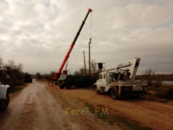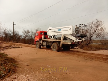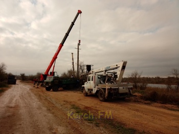 Поврежденные электроопоры Крымэнерго с сегодняшнего утра меняют на новые. Как только уровень воды позволил безопасно проводить работы, КРЭС доставил на участок 6 единиц спецтехники, усиленную бригаду электриков. Привлекли также технику из Феодосии.