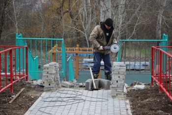 Трудятся подрядчики и на прилегающей территории, мостят дорожки и монтируют игровые элементы детских площадок. Другая часть работников занята установкой и покраской металлокаркасов - будущих козырьков.