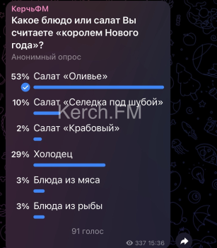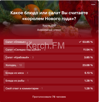 По результатам опроса Керчь.ФМ в группе ВК, 53, 85% жителей города считают «королем Нового года» салат Оливье. Так, данный салат занимает лидирующую позицию.