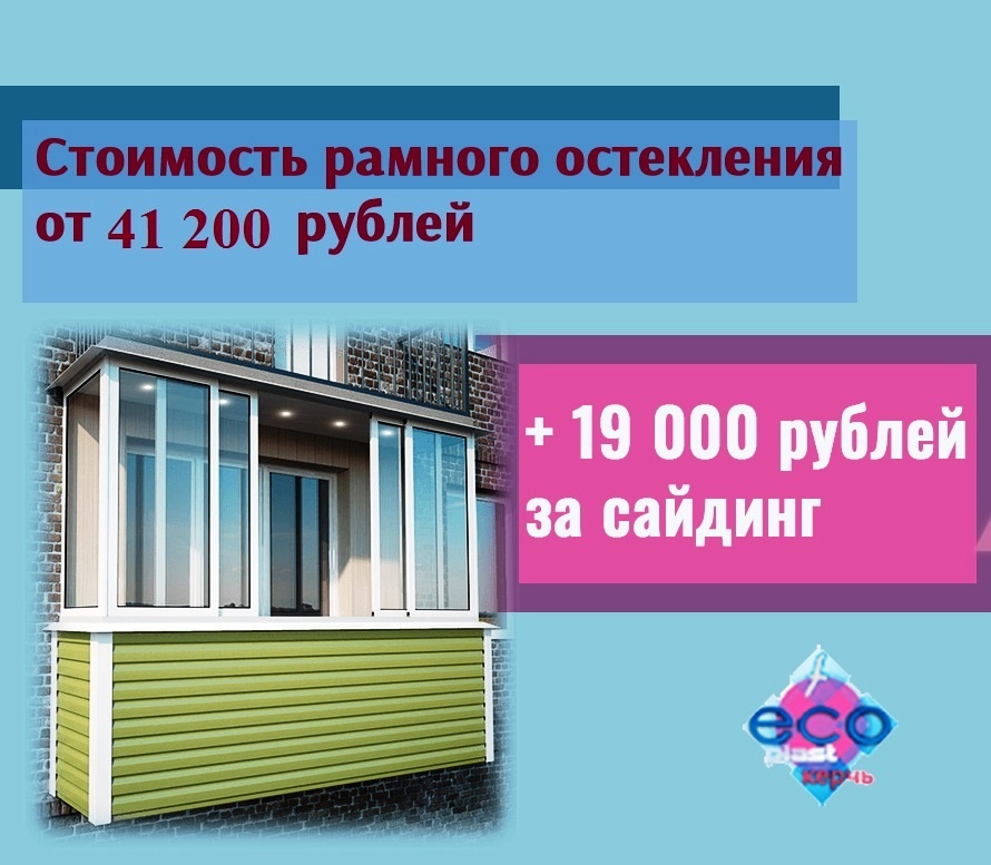 Стоимость рамного остекления от 41 200 руб + 19 000 руб за сайдинг под рамой.