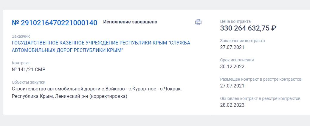 Стоит отметить, что госконтрат на строительство автомобильной дороги с.Войково - с.Курортное - о.Чокрак последним названием населенного пункта только так, намекнул на направление строительства. На самом деле одна ветка заканчивается у поселка, а вторая ветка на горе у дачного кооператива, никаким озером Чокрак там и не пахнет. Асфальтированной дороги к озеру как не было, так и нет. Хотя в портале Госзакупок контракт числится исполненным.