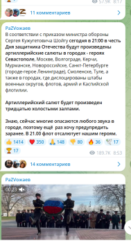 «В соответствии с приказом министра обороны Сергея Кужугетовича Шойгу сегодня в 21:00 в честь Дня защитника Отечества будут произведены артиллерийские салюты в городах - героях Севастополе, Москве, Волгограде, Керчи, Мурманске, Новороссийске, Санкт-Петербурге (городе-герое Ленинграде), Смоленске, Туле, а также в городах, где дислоцированы штабы военных округов, флотов, армий и Каспийской флотилии.