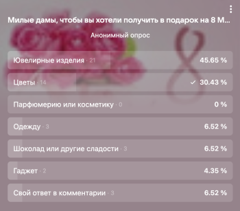 Ждут в подарок одежду 6% женщин, а также 6% ждут шоколад или другие сладости. Оставшиеся 4% хотели бы получить на праздник какой-нибудь гаджет.