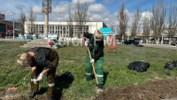 Зеленхоз Керчи приводит в порядок клумбу на кольце около автовокзала