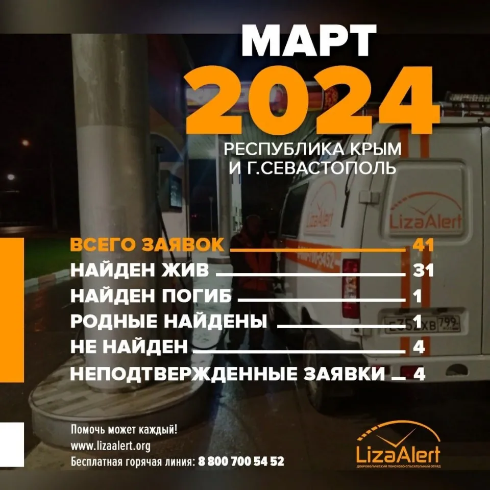 В поисково-спасательного отряда «ЛизаАлерт» сообщили, что всего за март была принята 41 заявка на поиск людей, - передает Керчь.ФМ.
