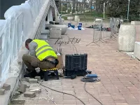 Рабочие восстанавливают конструкцию моста, прокладывают новую подсветку, изолируют ее.