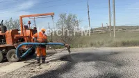С помощью спецтехники рабочие заливают дыры спец смесью. Перед этим из ям выдувают пыль.