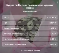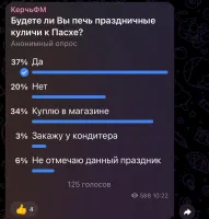 По результатам опроса в нашем сообществе «ВКонтакте»41.98 % опрошенных ответили, что будут печь праздничные куличи к Пасхе самостоятельно, - передает Керчь.ФМ.