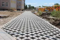 Рабочие устанавливают игровые элементы на детских площадках. Также на территории появились паллеты с тротуарной плиткой, которую в скором времени вымостят на пешеходных зонах.