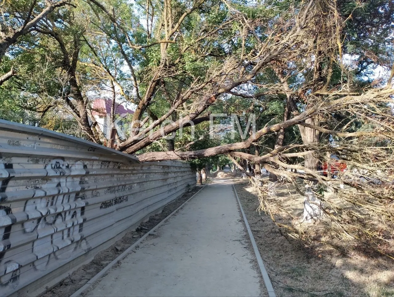 В Керчи 8 июля на улице Орджоникидзе над тротуаром повисло дерево. Оно упало ночью.  К счастью, его задержал забор, и оно не упало на пешеходную зону. Стоит отметить, что под ним ходят люди, - передает Керчь.ФМ.